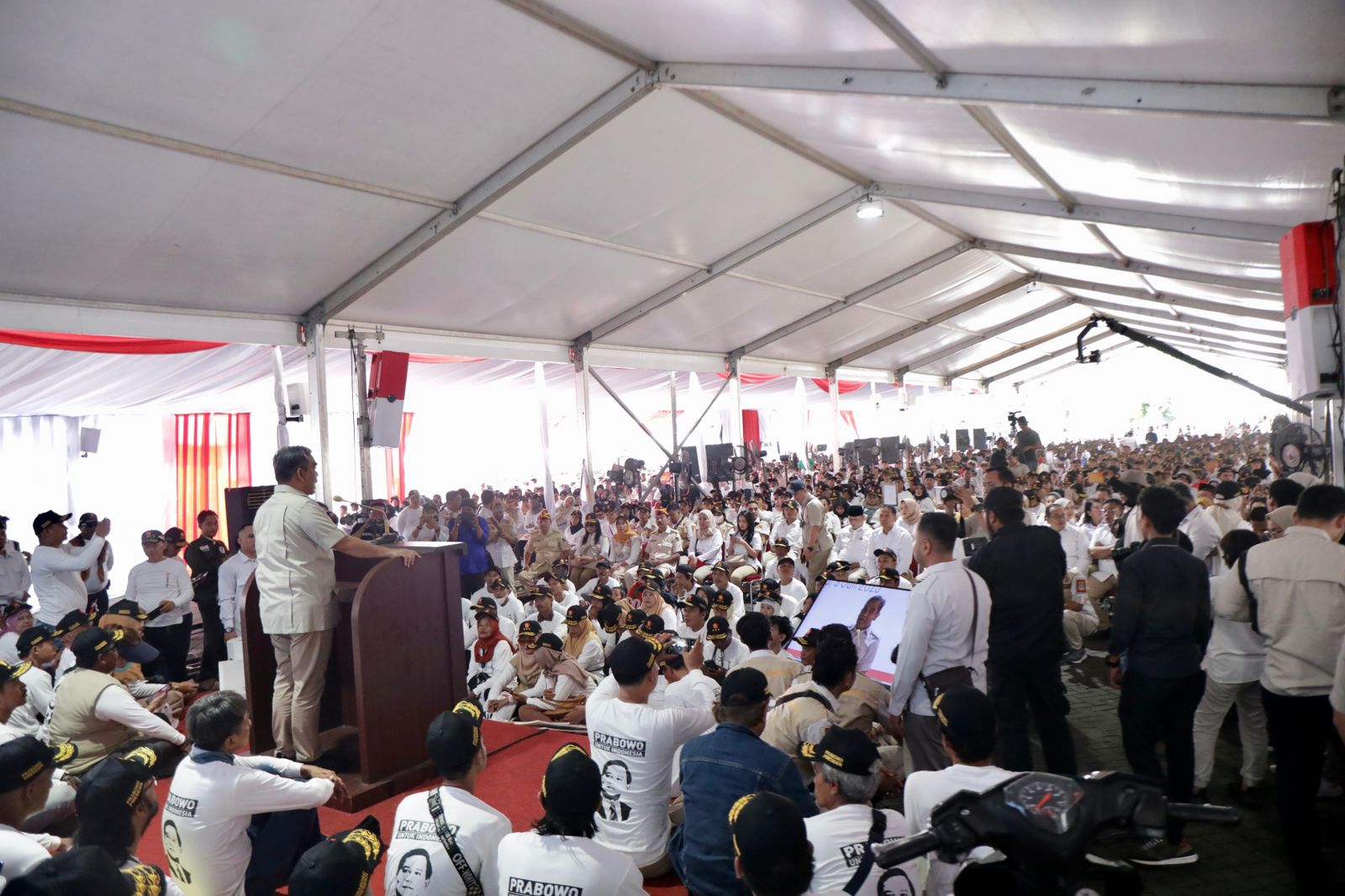 “Saya titip Gerindra dimenangkan di kampung-kampung mu, di gang-gang mu. Saya titip Pak Prabowo untuk dimenangkan di setiap TPS mu. Ajaklah saudaramu, tetanggamu di depan, di belakang, kanan dan kiri untuk memilih Prabowo. Tapi tetap harus dengan cara tenang dan santun, tidak usah fitnah, gontok-gontokan. Kalau ada yang caci balas dengan kebaikan. Kalau ada yang menjelek-jelekan Pak Prabowo, dijawab dengan tenang dan benar. Karena kita ingin berpolitik yang gembira sesuai arahan Ketua Umum kita,” jelas Muzani.